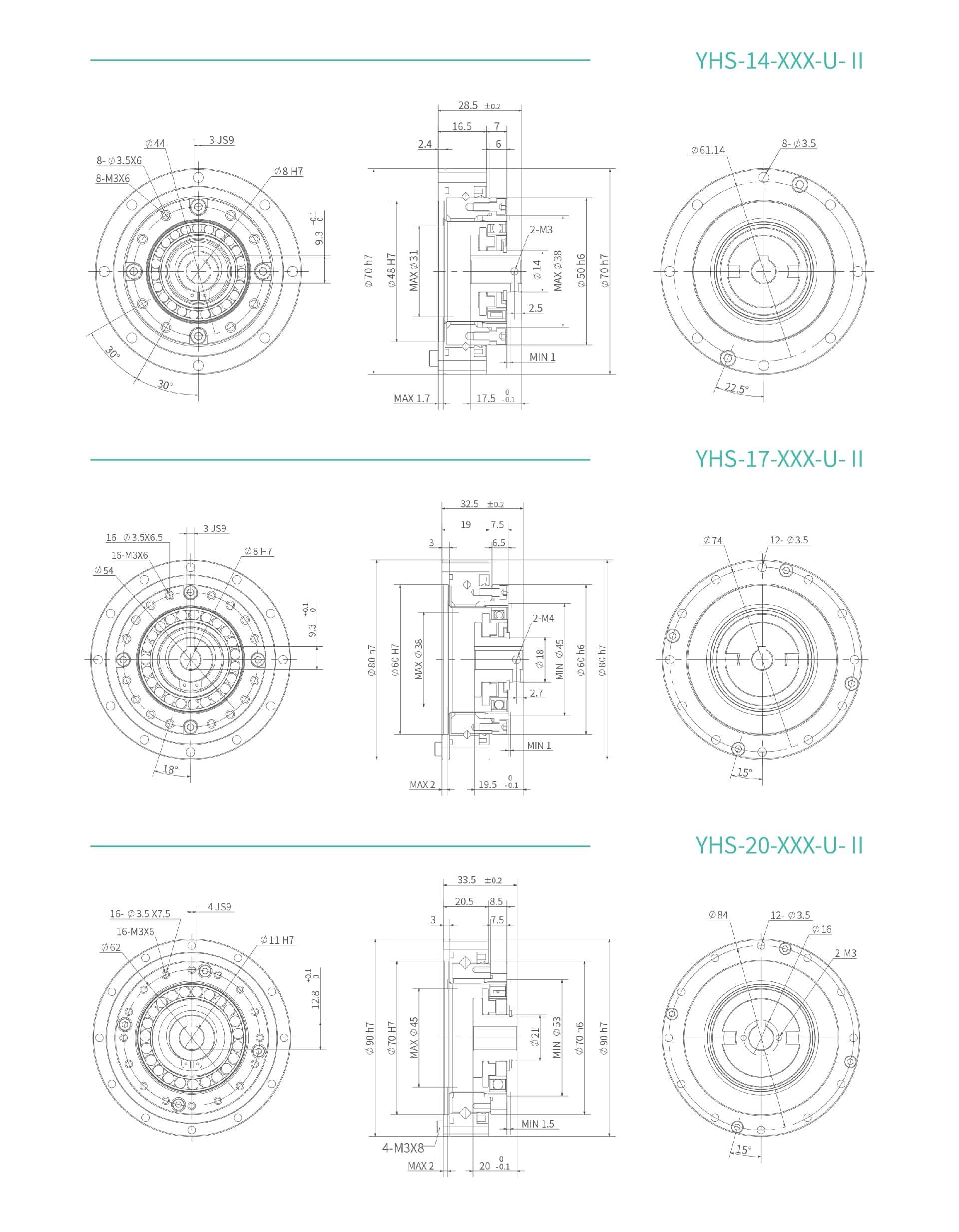 YHS-Ⅱ系列柔輪為中空翻邊形標準結(jié)構(gòu),整機機構(gòu)緊湊,輸入軸通過十字滑塊軸聯(lián)軸器與波發(fā)生器內(nèi)孔配合,通過平鍵連接。既可采用剛輪端固定,柔輪端輸出的連接方式使用;也可采用柔輪端固定,剛輪端輸出的連接方式使用