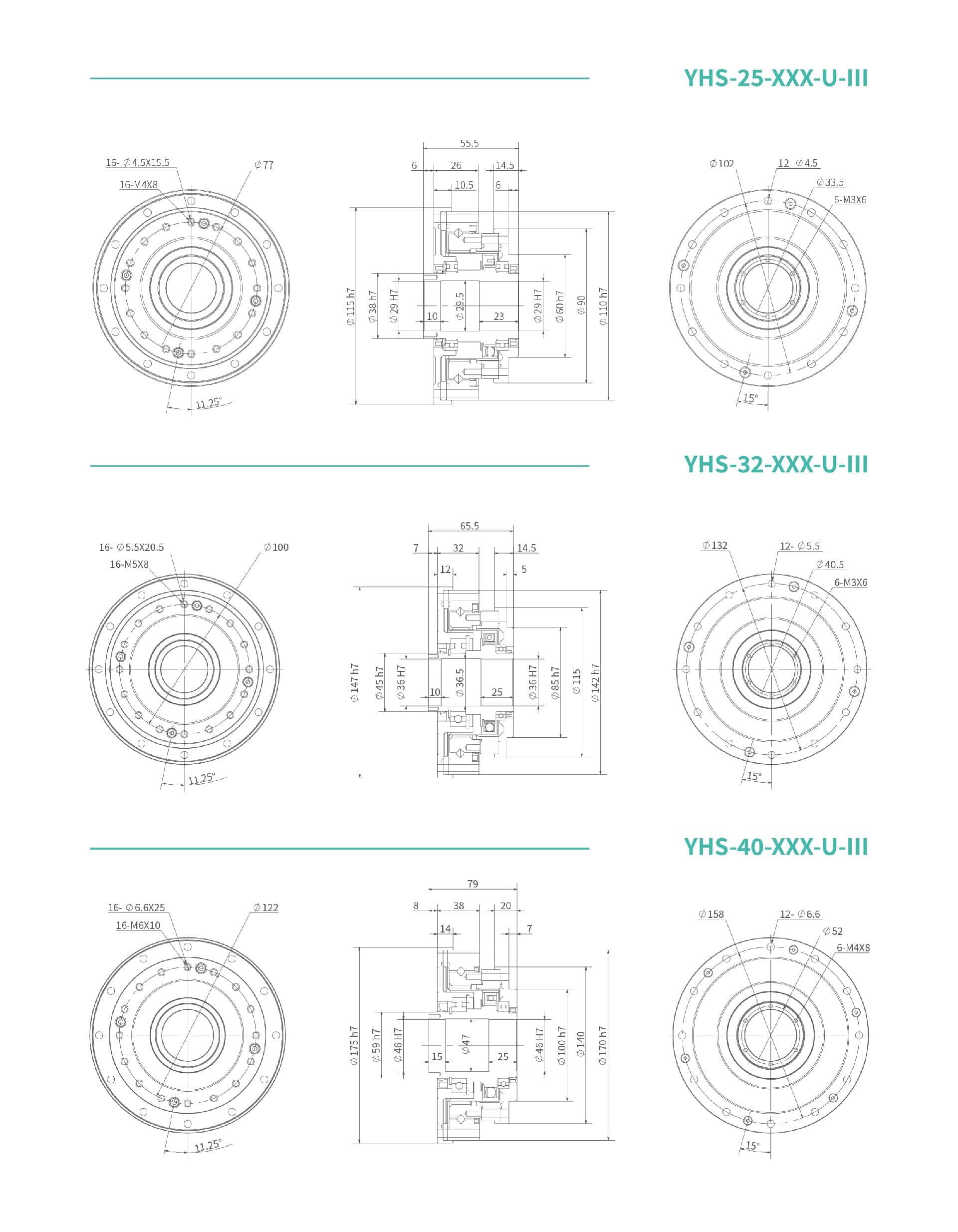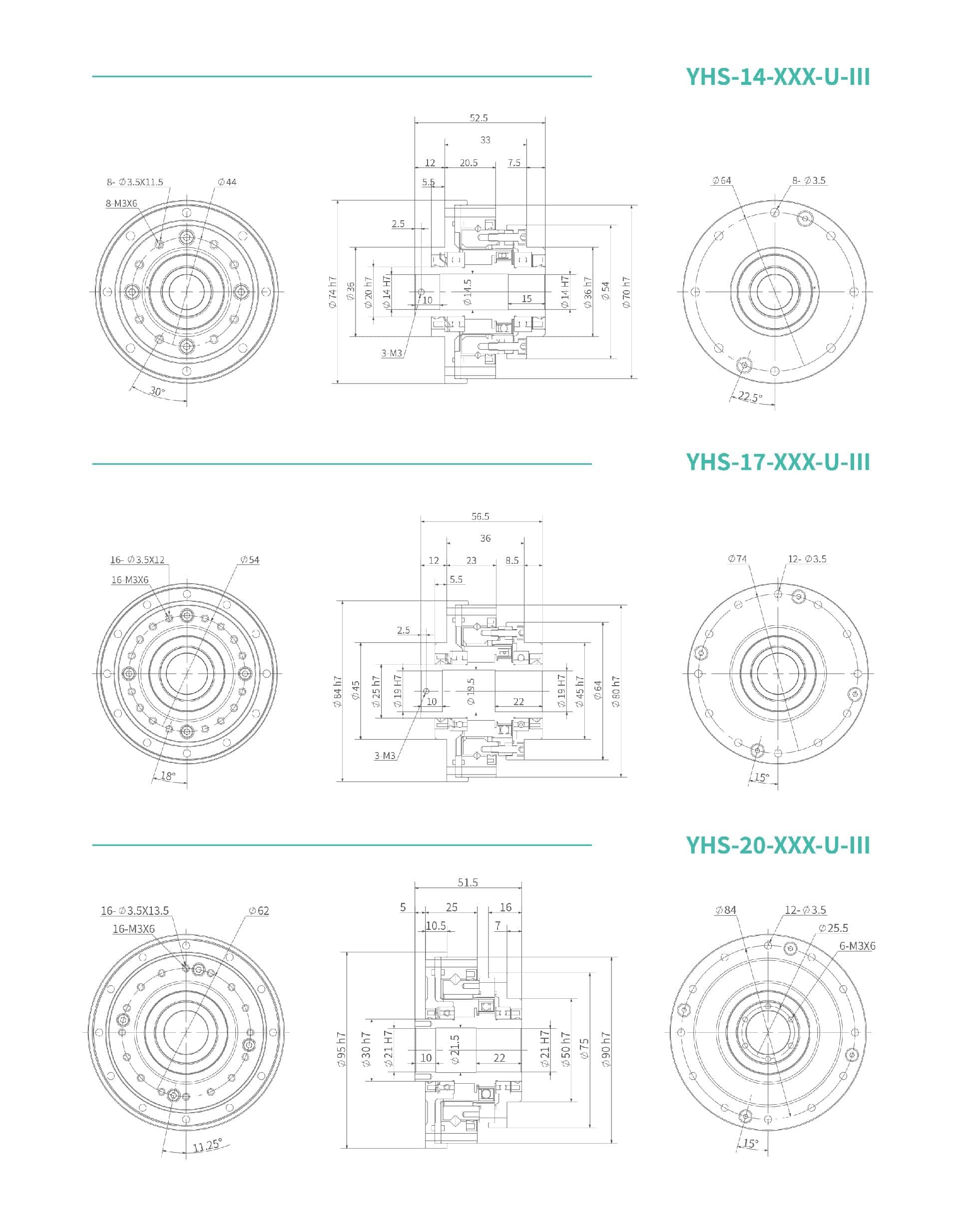 YHS-Ⅲ系列柔輪為中空翻邊形標(biāo)準(zhǔn)結(jié)構(gòu),波發(fā)生器為大口徑中空軸。減速器內(nèi)部設(shè)計兩端均有深溝球軸承支撐,全密封結(jié)構(gòu),安裝簡便,非常適合于需從減速器中心穿線的場合使用。