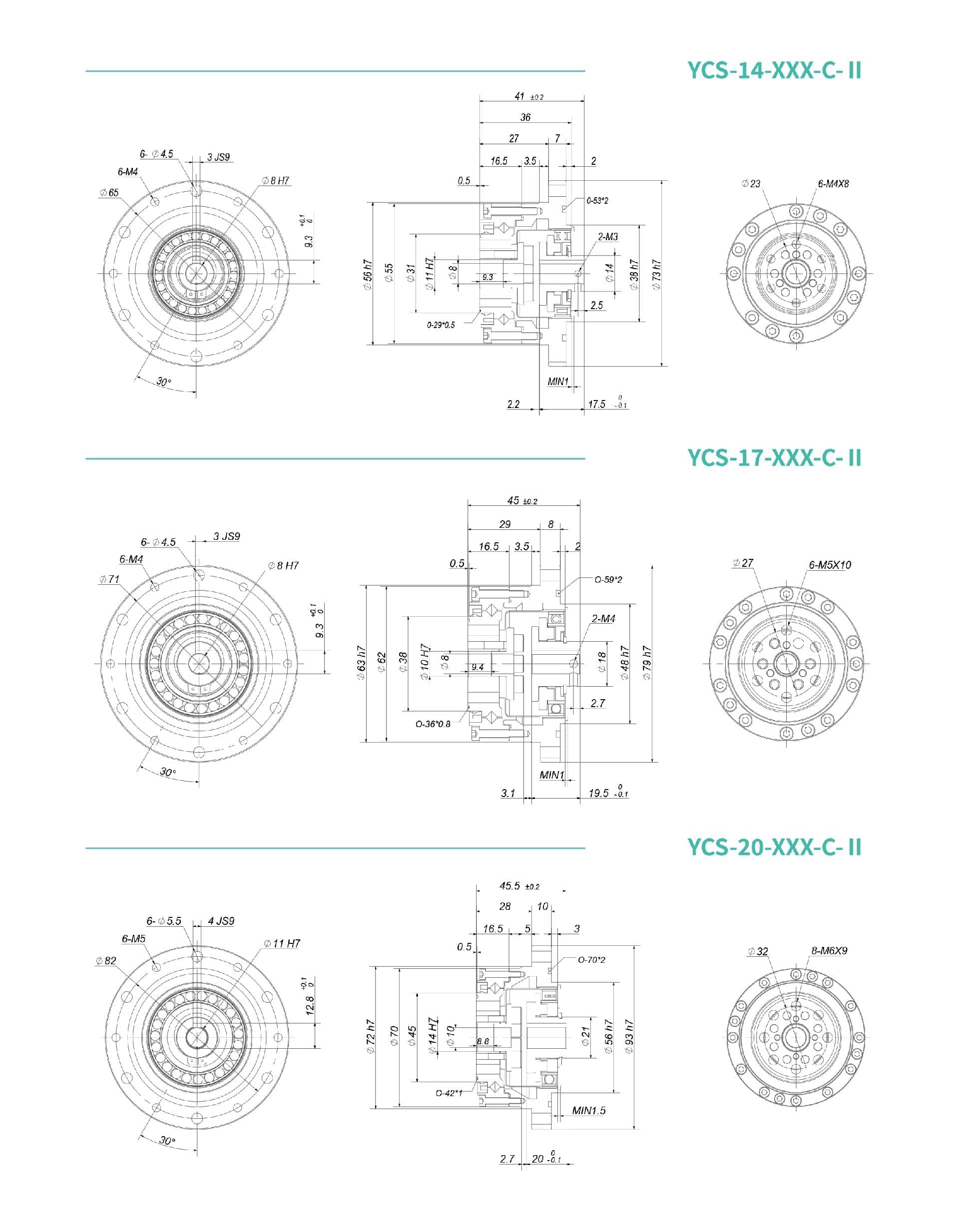 YCS-Ⅱ系列柔輪為杯型標(biāo)準(zhǔn)結(jié)構(gòu),輸入軸通過十字滑塊聯(lián)軸器與波發(fā)生器內(nèi)孔配合,通過平鍵連接。通常采用剛輪端固定,柔輪端輸出的連接方式使用。